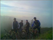 From the City, we rolled to the house of Gary the Wrench, who conveniently lives at the foot of the trail. There we met up with CrankenFine and DJ McNipple. In the pits at Casa de Wrench, there was a lot of last-minute fiddling and oiling and pumping and pissing. The thing with a group this large is to initiate and coordinated action, we must overcome the significant inertia of five "fellow travelers" in order to get moving again. On the way to the trailhead, we picked up another rider for a grand total of six. The first stretch is called the Alchemist Trail, and it is one of the sweetest pieces of uphill singletrack you'll ever ride. It's challenging, technical, and uphill, but it's also at the perfect gradient to really lay some wood on the field and let gravity peel riders off. I spent the first half of the Alchemist getting my sea legs, then after a regroup, I busted out and ripped on up to the top. I LOVE CLIMBS!, especially this one. Somewhere along the Goldman Trail, we halted for a safety meeting. A heavy, Argonne Forest fog hung down low in the trees but dissolved on its way up the hills, revealing an awesome collection of sunny hilltops looking like the tips of corn candy sticking out of a schmeer of vanilla frosting. Even in the sun, a chilly wind worked quickly to turn a well-earned lather into cold, wet clothes. Eventually, everybody started to feel the chill a bit and we resumed riding towards the Serpentine and the Wagon Wheel trails. Working our way around the Tamarancho loop, we started to bog down with some stoppage, especially on the long climbs. It soon became clear that we would not really have enough daylight to achieve significant mileage. Everybody brought a set of lights, but it's technically illegal to ride 'Rancho after dark, and we're all law-abidin' riders occifer. Somewhere along the way, I lost track of the right turns, left turns, proposed turns, possible turns, and turns to take next time. It was brilliant trail, including some of the hairballinest rockgarden downhill you could hope to ride. Throw in wet conditions and lots of extremely slippery tree roots, and hang on baby, you going fer a ride! At the "top", we used a "secret door" to access a wicked little stitch of insider's singletrack. The "secret door" consisted of us hopping off our bikes and traversing briefly cross country to the hidden stitch so as to leave no wheel tracks. To our dismay however, we noticed that some chucklehead had ridden a bike from the main trail to the hidden stitch. Ya know, . . . Somewhere else along the way, we encountered another beautifully challenging rock garden stretch of maybe 150 yards. This one was even better because it was uphill. I pulled it, but there were a couple of spots where I almost didn't have the speed to roll over the loose, awkward rocks. At the top of the hill, we paused to look around. Up there, we were so damn high we should've filed a flight plan. It was all downhill from there, in a good way. The downward plunge included the legendary Repack trail. The action was fast and furious with Gary the Wrench, DJ McNipple, and CrankenFine setting a quick and nimble pace. About halfway down though, Romulus pulled up lame with a flat. Rom seems to get his flats mostly on downhills, which would scare the crap out of me. In the gathering dusk, it took about 10 minutes to change the flat, but that time saw our window of light close down and everybody donned their lights. Other than a minor spill by me during the first couple of minutes after we started up again, the rest of the ride was a whirling, spinning, shifting, braking, shit-eating grin of a downhill run on exquisite singletrack in the darkness under the Redwoods. I entered dream state. Lest we venture out into the bustling streets of residential Fairfax dazed and drooling menaces to other motorists, the citizenry, and of course Fairfax's finest, of which I have some personal experience, six or seven icy stream crossings at the bottom of the trail were as effective as a cattle prod. The first crossing drenched my feet and put the chill of God in me right quick. By the last crossing, I was pushing the pedals with two footcicles. It must have looked pretty cool from elsewhere in the woods to see five sets of lights swishing down the trail and through the creek. The forest at night, is just right, for hallucinations of fancy's flight. So in the end, the mileage came up a little shorter than I had hoped, but the trails did not disappoint and it's always fun to ride with the crew. Leave a little bit left for next time -- that's part of the Cannonball trail-riding ethos. There's more of Tamarancho left undiscovered to me. Some day, some day.
